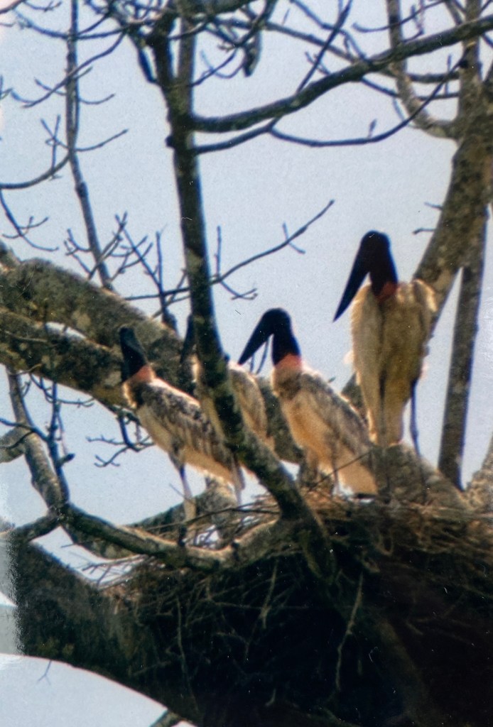 One day in Belize we traveled our 10 miles by boat, seeing howler monkeys, various parrots and even an occasional crocodile along the river.  It was like a Disneyland jungle cruise only real.  While enjoying fishing for snook and 10- to 20-pound tarpon, I spotted a wood stork flying overhead and asked our guide if he had ever seen the even larger, endangered jabiru—at almost five feet tall among the largest birds in the Americas.  He answered by asking, “Would you like to see one now?”  My “yes” came without hesitation.  So a little farther up river we tied our boat to a wharf.  Our guide’s cousin appeared, a slender, dark-skinned man with a big smile and shirt half-open, holding a large machete that we were relieved to find he was using to cut sugar cane.  Without thinking, I told him he looked like Rambo with that knife.  He laughed heartily because he had seen a Rambo movie.  There were no roads into his jungle home, so to do that he had boated some miles down the river and picked up a ride into Belize City.  He seemed to enjoy showing us the tree and the huge nest with an adult and three young jabiru storks.  He was proud to be protecting those magnificent birds.