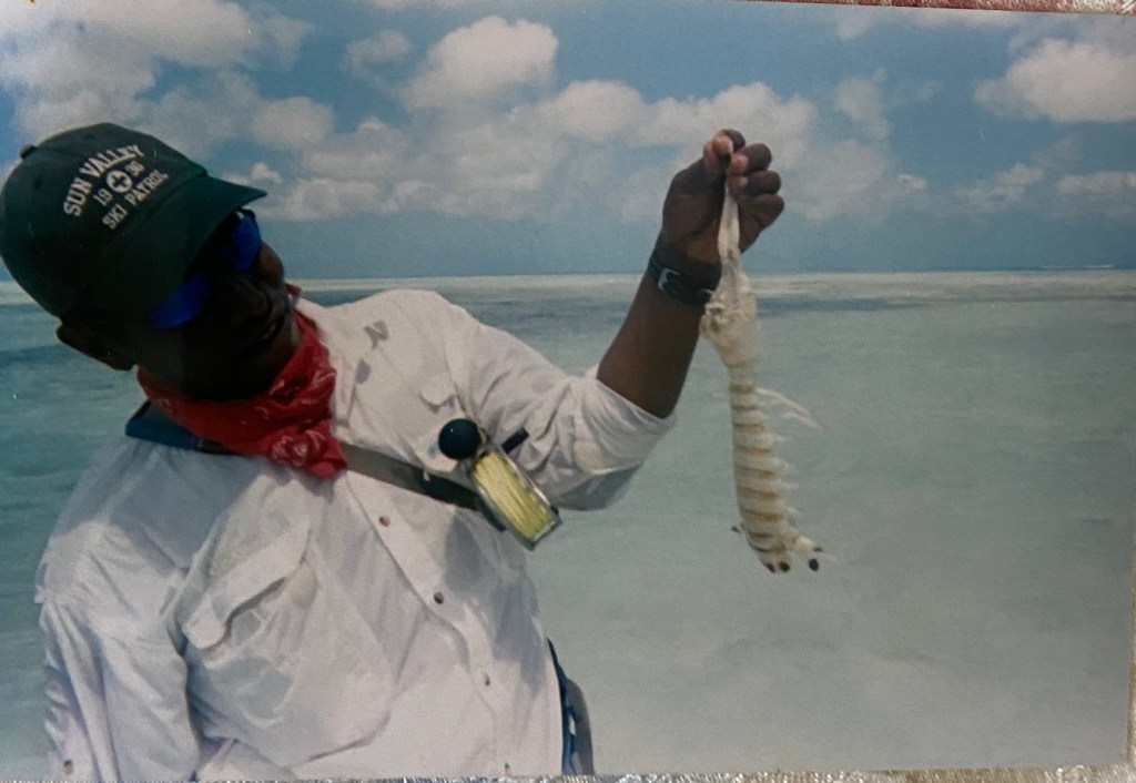 I believe my most unusual 10-mile walk was a meandering wade through channels of water within the coral atoll of Christmas Island.  As we started that wade scanning for bonefish, our guide pointed to an island we could barely see on the horizon and told us that was where we would stop for lunch.  This was going to be a long walk.  The moment that left the deepest impression on me came when our guide tied a small fish to a line and wiggled it enticingly above a hole in the shallow, gravelly bottom.  Almost immediately there was a violent subsurface clash as something shot out of that hole to grab the fish.  Our guide carefully lifted a writhing, foot-long creature out of the water—a mantis shrimp.  Eventually he caught a few more, handling each one with extreme care.  He showed us their razor-sharp claws and told us that these aggressive little animals were known to inflict deep cuts on unwary anglers.  I was thankful not to be wading barefoot.  And those small predators made a delicious appetizer that evening.